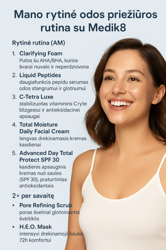 Sezoninė oda reikalauja pastovumo ir tinkamų priemonių. Mano Medik8 rutina padeda palaikyti odą sveiką, švarią ir spindinčią tiek dieną, tiek naktį.
